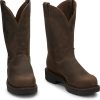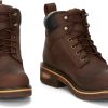 Its built for durability and comfort in even the roughest work conditions with a distressed golden brown leather exterior that is also waterproof for added protection against the outdoor elements. The yellow, orange, blue stitch pattern along the upper give this boot a retro feel and its square toe provides a relaxed fit. The J-Flex Flexible Comfort System® insole cushions and supports the foot and the Stampede™ rubber and EVA combination outsole guarantees resistance to abrasion, chips, slipping, and marking allowing you to comfortably work on any surface.