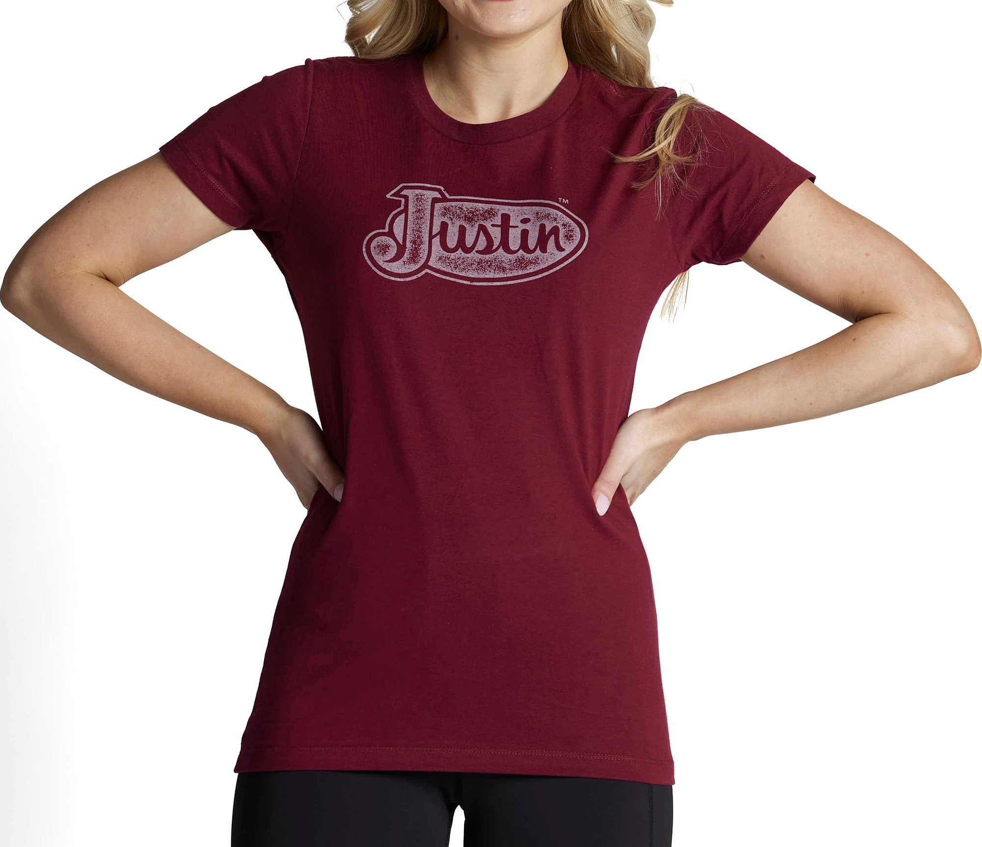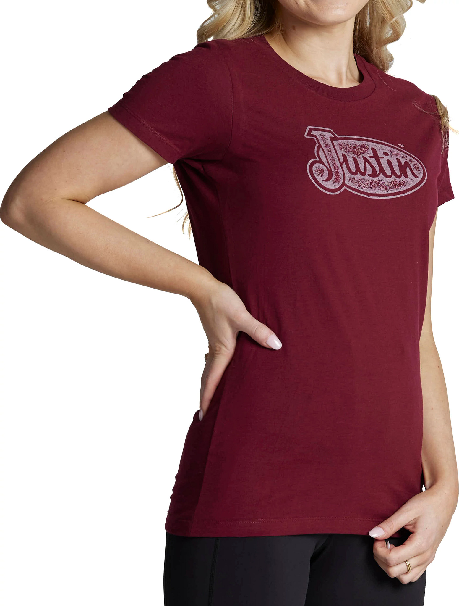 Our signature logo tee in burgundy has a relaxed, slightly distressed look and a flattering fit.
