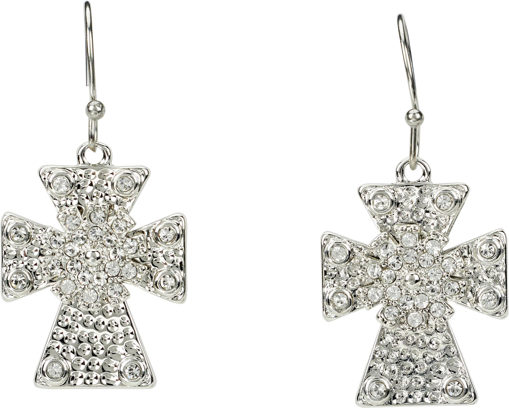This pair of silver earrings is made from zinc alloy with silver plating. It features a cross-shaped charm with w wire French hook attachment with a ball end.