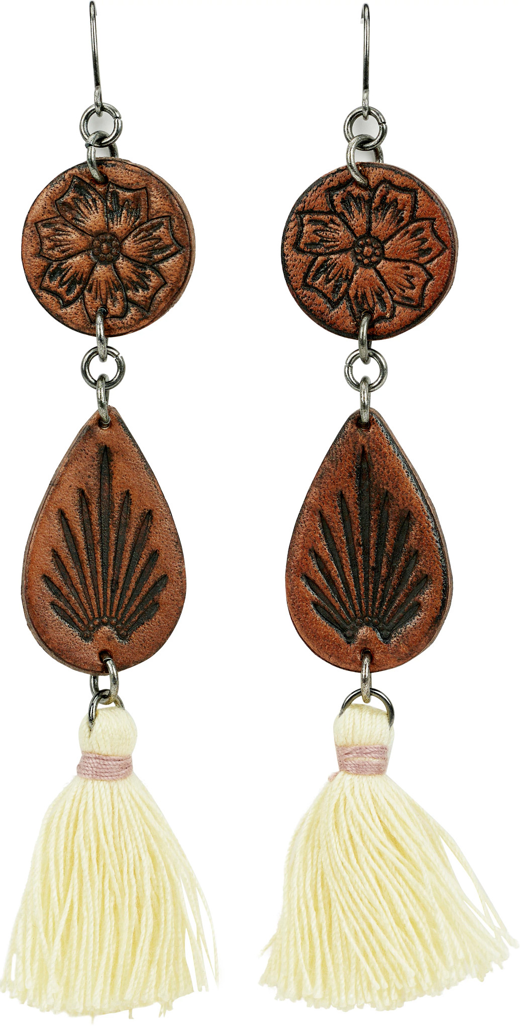 Pair of western inspired earrings made from leather and plated copper with an ear wire attachment. These earrings include a saddle tan colored charm with a dusty wash.