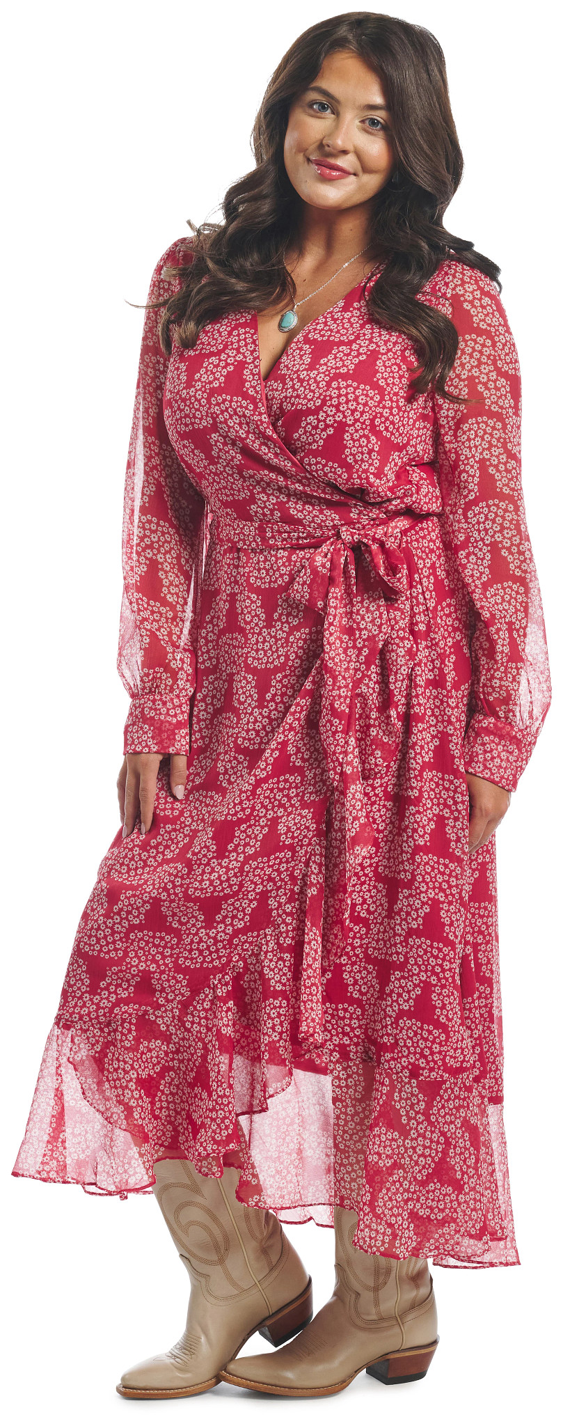 Elevate your Western style with our Red Floral Wrap Maxi Dress featuring a unique longhorn skull pattern. This vibrant dress effortlessly blends classic charm with a touch of the frontier. The flattering wrap design and sweeping maxi length make it a perfect choice for a bohemian-inspired look. Embrace the spirit of the West with a bold splash of red and a distinctive longhorn skull motif, making this dress a standout piece in your wardrobe.
