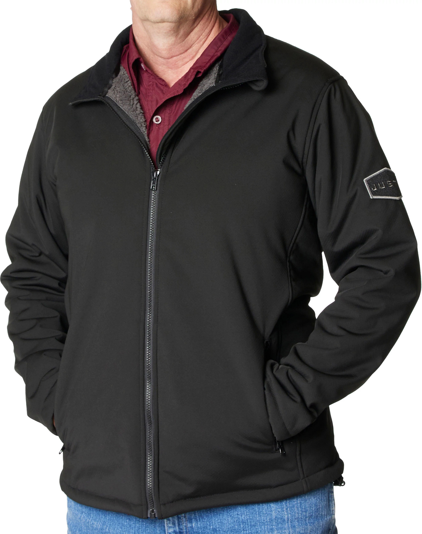 Crafted of a lightweight 88% Polyester / 12% Spandex blend designed to help keep you dry, this breathable tech jacket has a warm and soft high-pile sherpa fleece lining crafted from durable polyester. Zippered pockets let you carry your wallet, keys and phone hands-free.