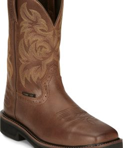 Its rugged golden brown leather exterior is garnished by a light yellow stitch pattern along the upper giving this boot a lived-in feel. The square composition toe vamp provides protection without weighing the foot down. This boot also features the J-Flex Flexible Comfort System® insole that cushions and supports the foot and the Stampede™ dual density rubber outsole with resistance to abrasion, chips, slipping, and marking which allows you to comfortably work on any surface and meets ASTM F2413-11, I75, C75 EH safety footwear standards.