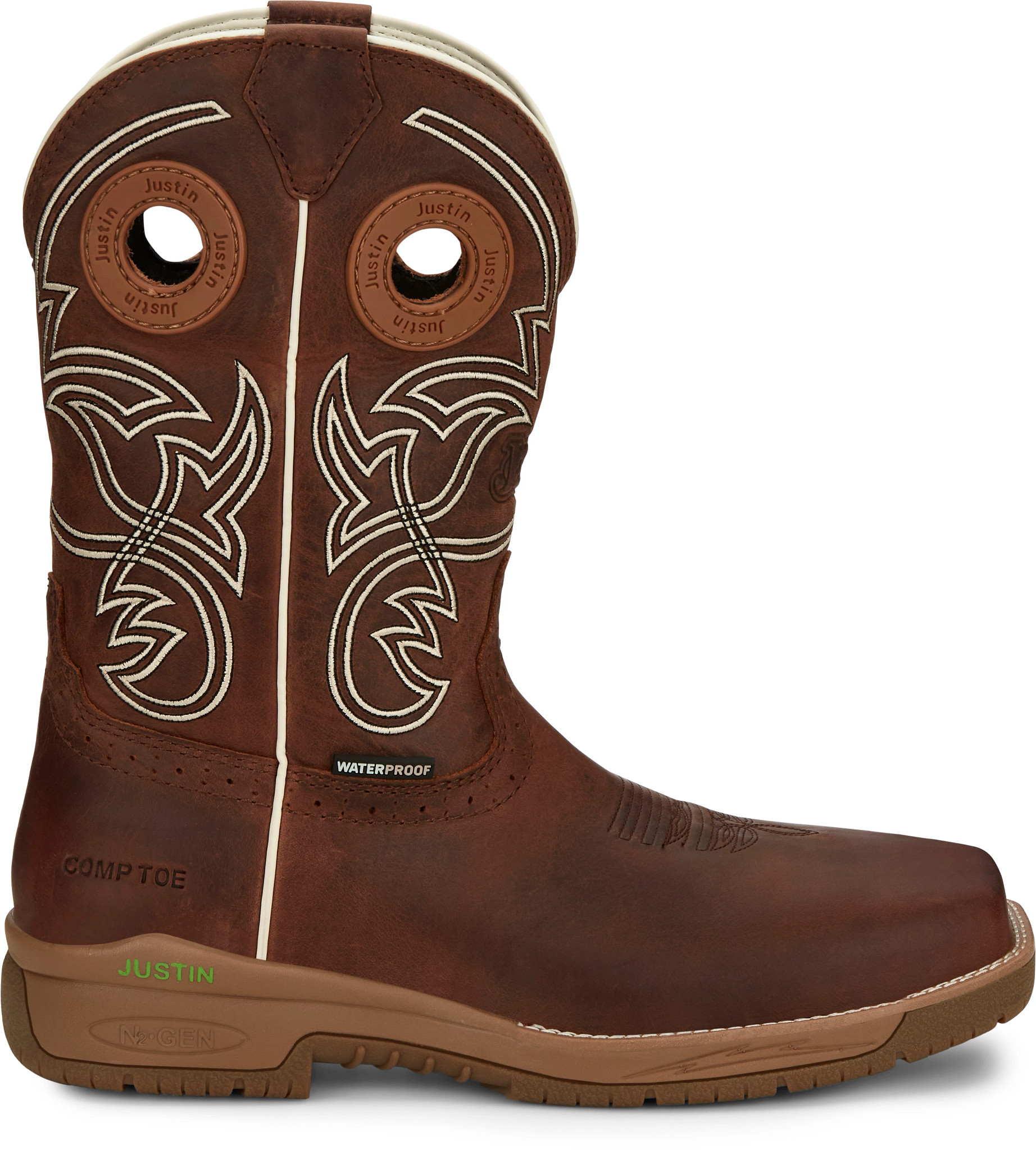 This 11” waterproof nano comp toe boot is built with new high-tech features designed to keep you comfortable long after the workday is done. The NiTread features the new N2Gen™ technology in the insole which includes nitrogen encapsulated impact zones in the midsole that absorb shock, then redistribute the energy to reduce foot fatigue throughout the day while helping to extend the life of your boots. It also includes a Removable Ortholite® Insert, an oil-and slip-resisting rubber outsole to keep you steady on your feet all day, and our nano-composite toe – our strongest, most lightweight safety toe that’s designed with added toe room. This boot is electrical hazard rated and features a non-metallic shank. Safety features meet ASTM F2413 safety footwear standards.