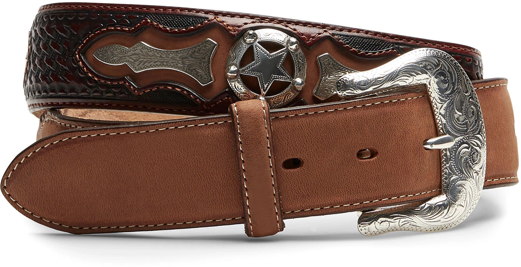 Featuring basketweave-embossed leather, a silver-plated buckle and etched inlays for a statement look. The leather measures 1 1/2 inches wide.