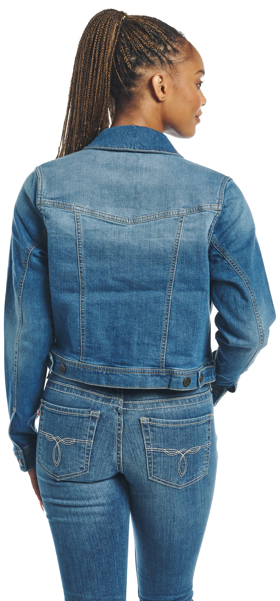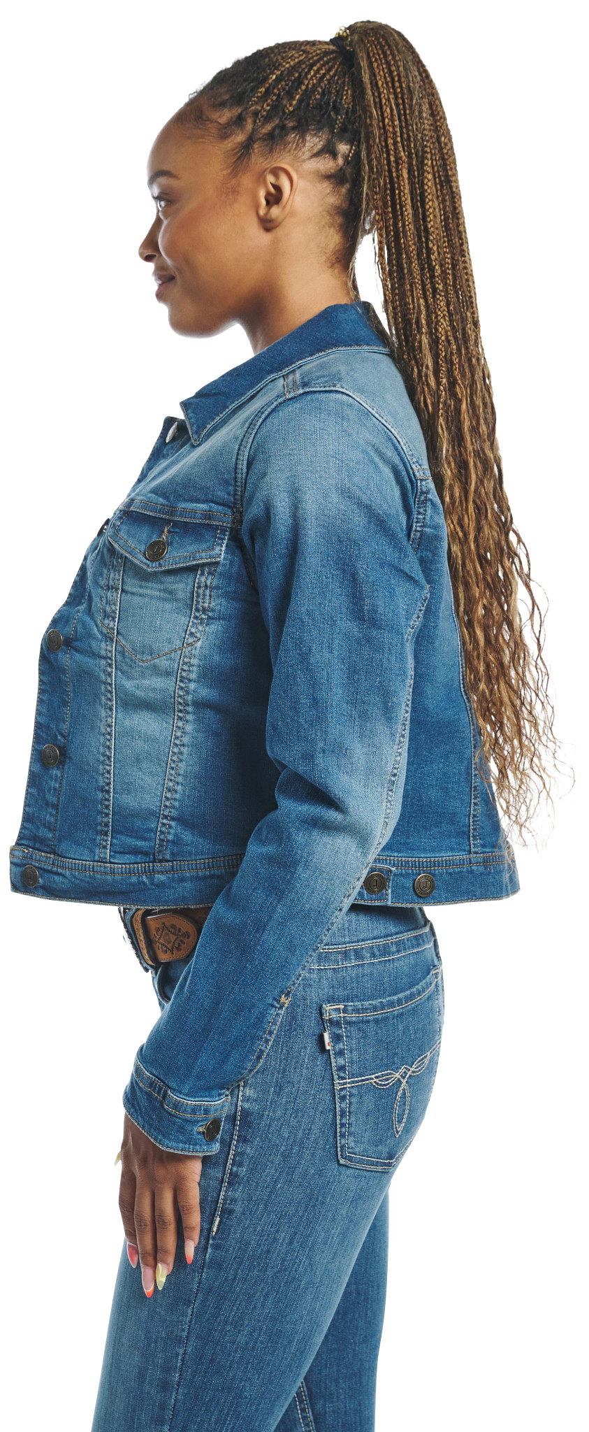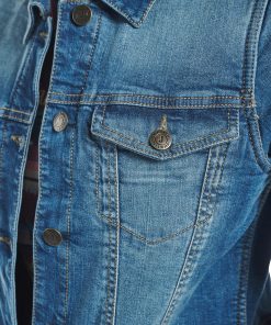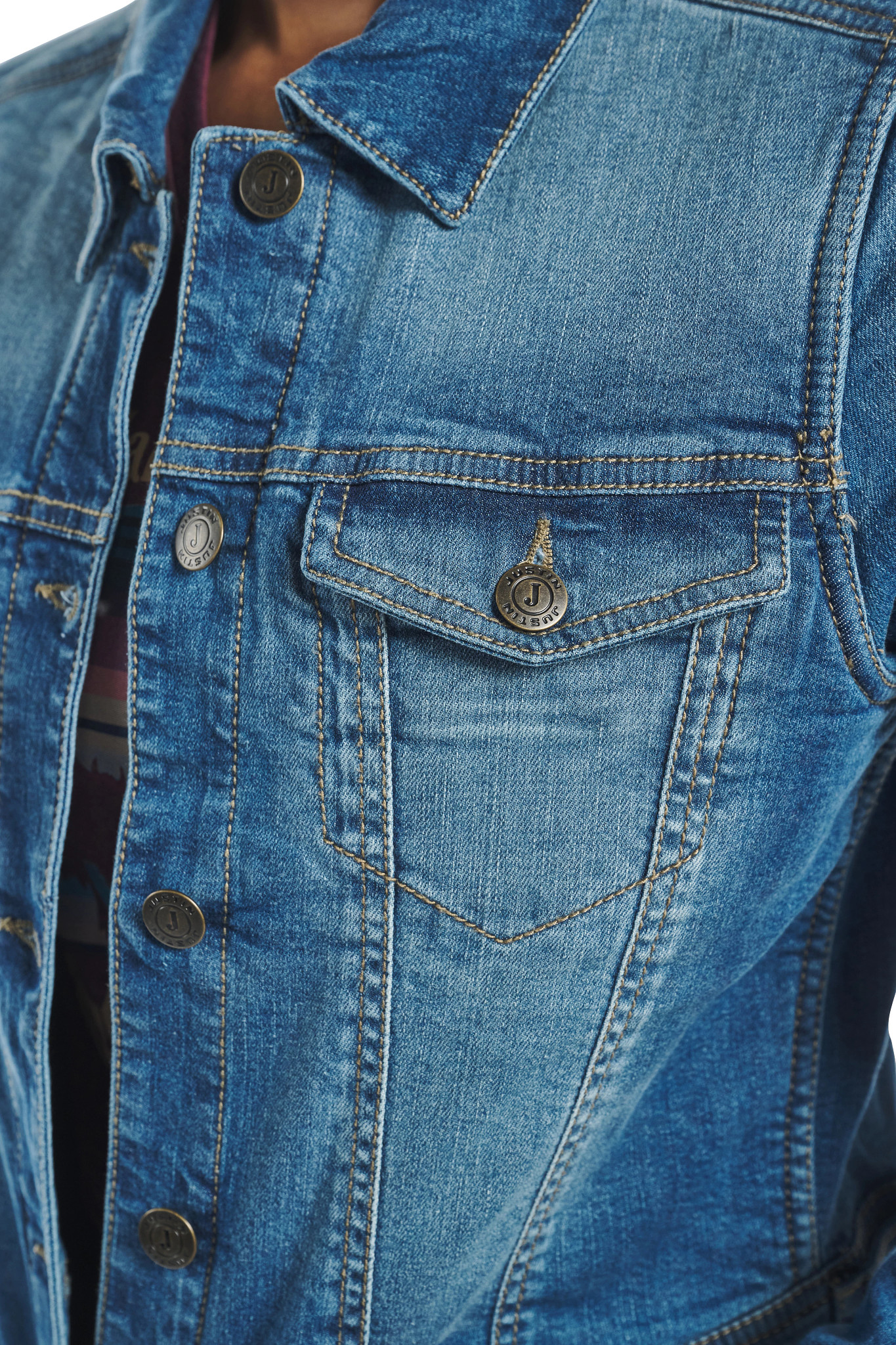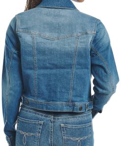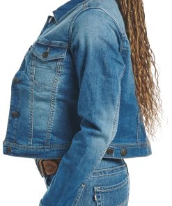 Stylish women’s jacket in medium wash with a button-down front, featuring two upper button-down pockets, an internal conceal carry pocket, and two bottom welt pockets for both fashion and functionality.