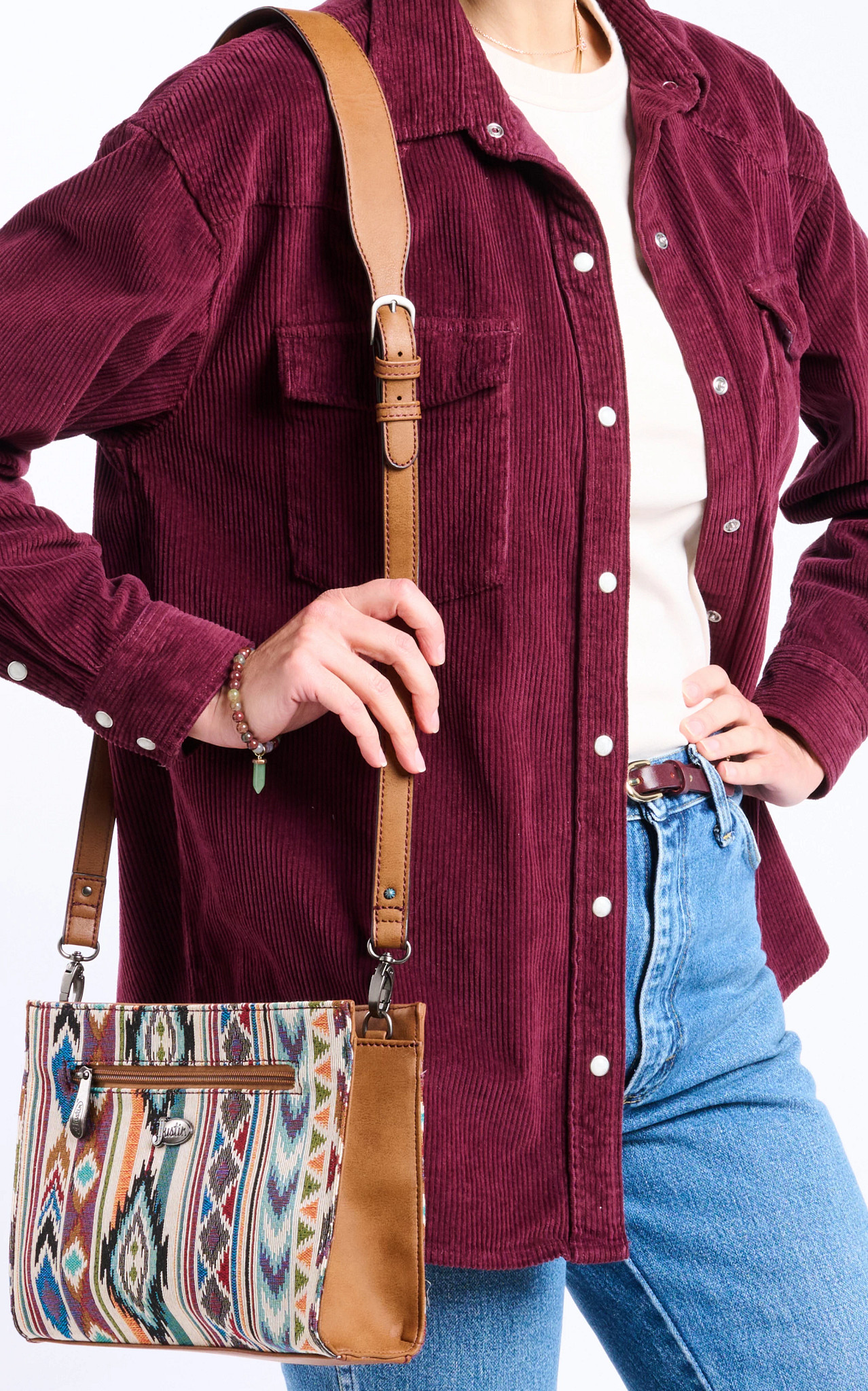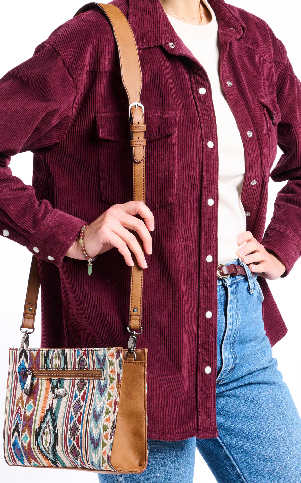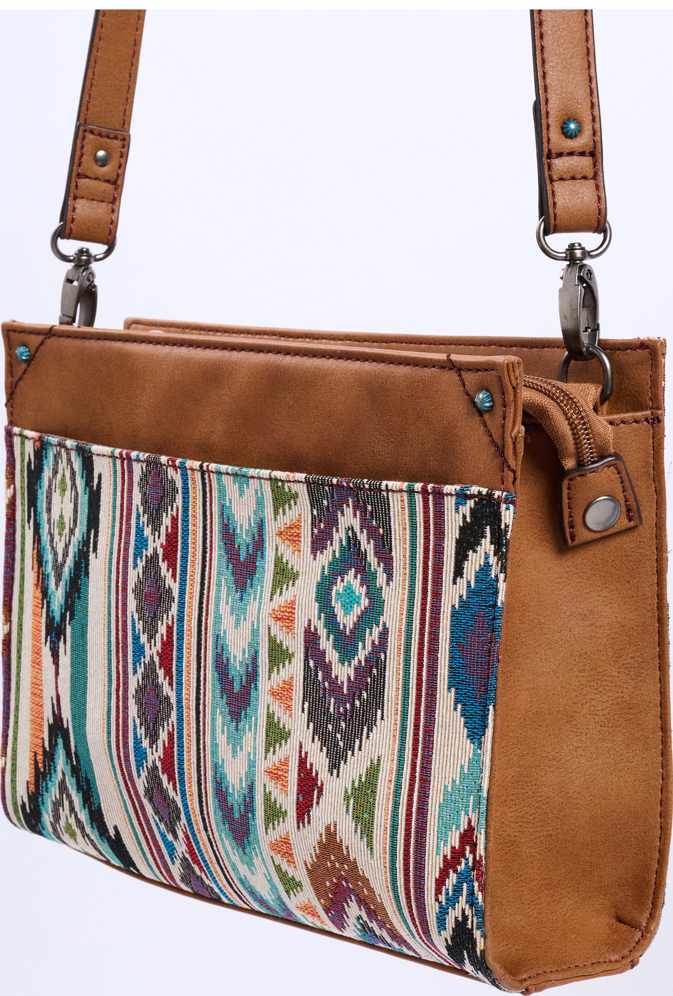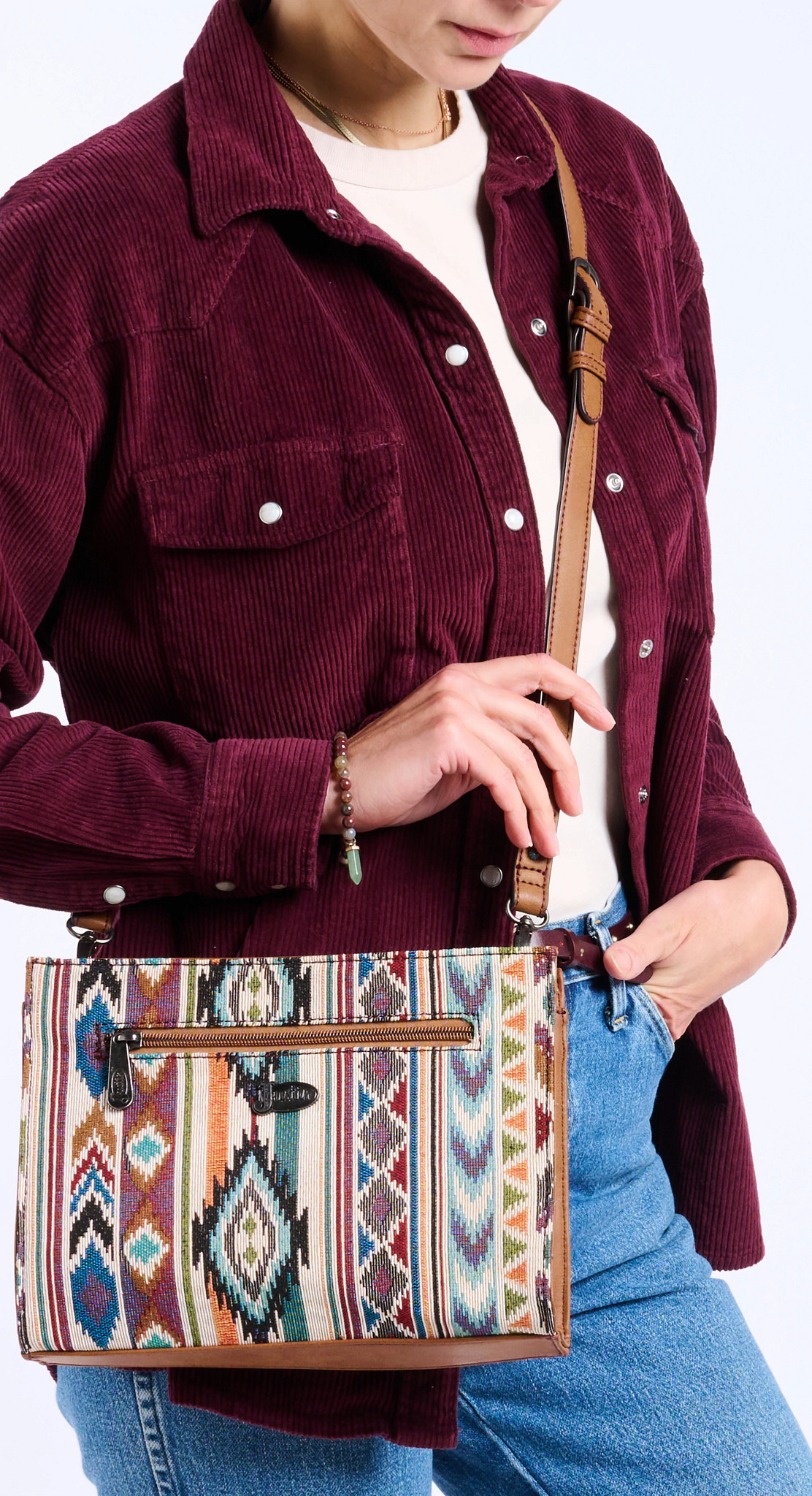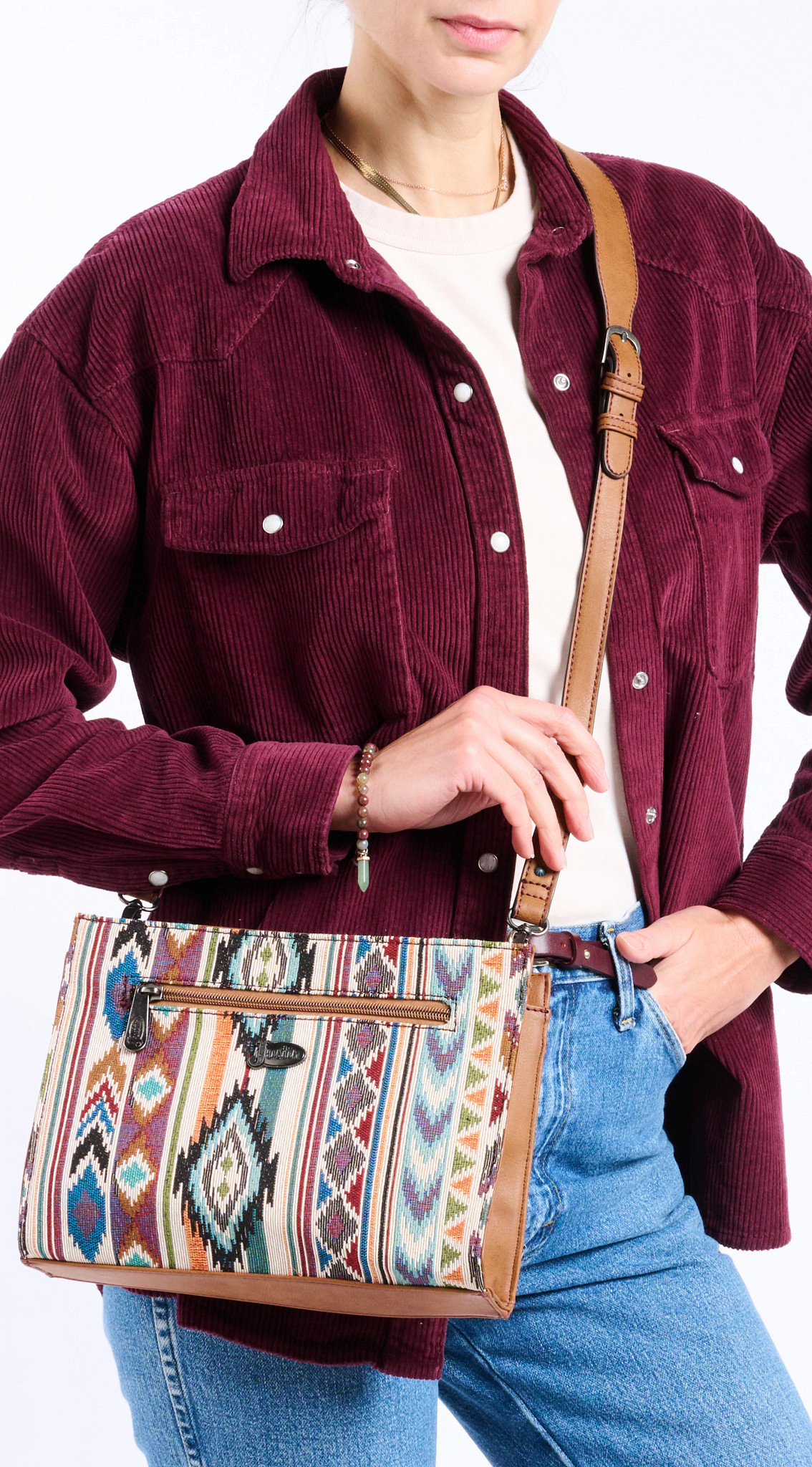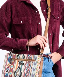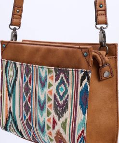 Elevate your accessory game with this stylish crossbody bag, featuring a vibrant woven pattern inspired by Southwestern designs. Accented with vegan leather details for a timeless look, it includes a spacious interior and an adjustable wide strap for versatile wear. Perfect for adding a touch of bold flair to your everyday outfits.