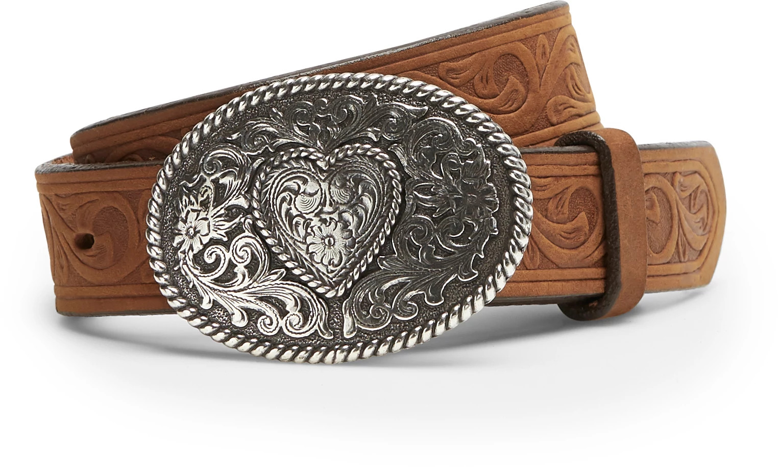 This charming belt features unique embossed details and a sleek tapered end. The eye-catching antique silver oval buckle showcases a beautiful heart design, adding a special touch to any outfit. Made from high-quality leather, this belt is both durable and comfortable, perfect for everyday wear. Ideal for pairing with jeans, cowgirl dresses, or any ensemble that needs a hint of old-west charm. A must-have accessory for little fashion enthusiasts!